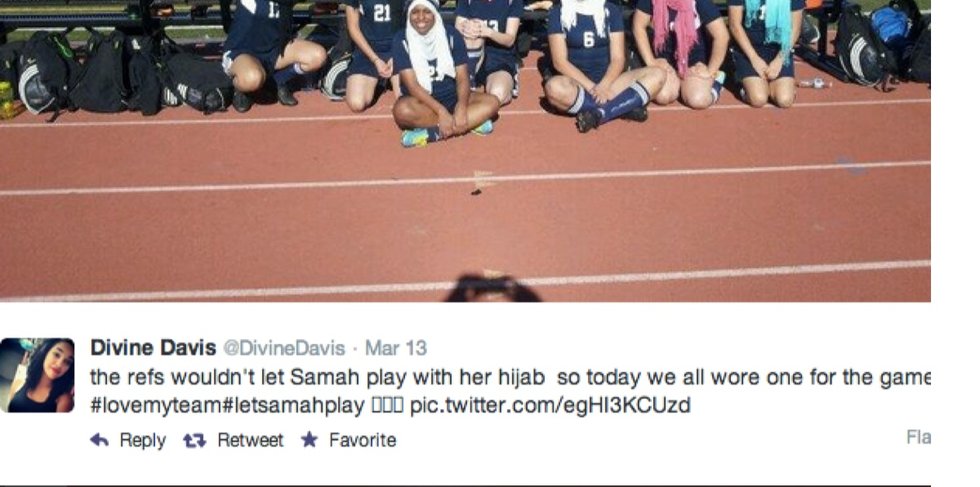 In my home state of Colorado, at Overland High School, a Muslim soccer player named Samah Aidah was banned from playing in the game because of her hijab (due to an outdated safety rule). So when the next game came around, the entire team did the only logical thing.