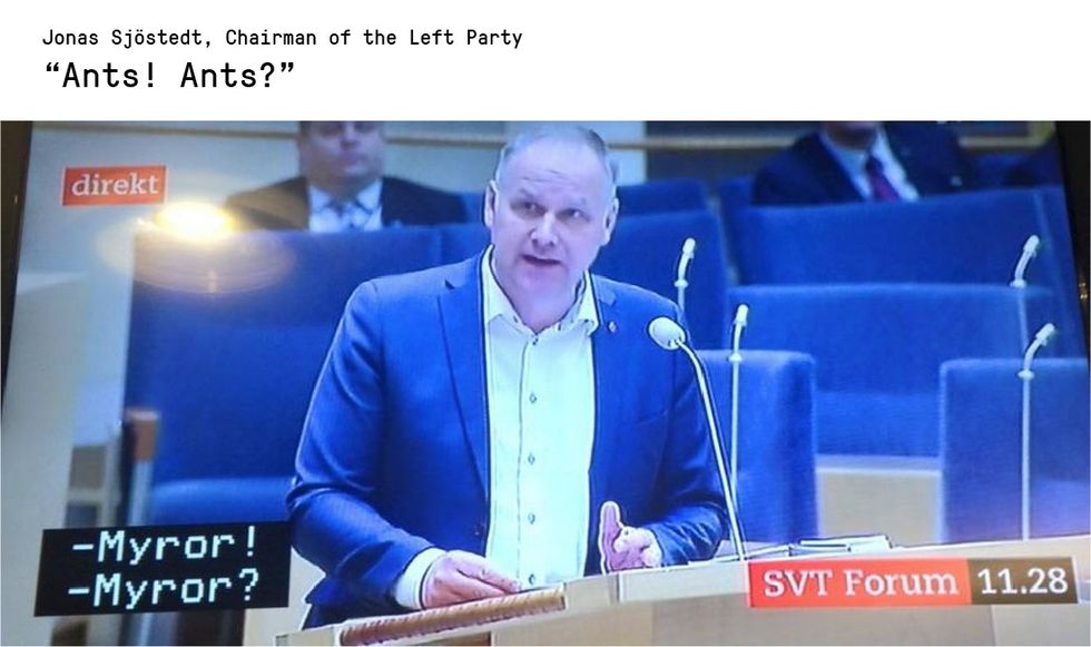 Things only got stranger when Jonas Sjöstedt, Chairman of the Left party, proclaimed, “Ants! Ants?”
