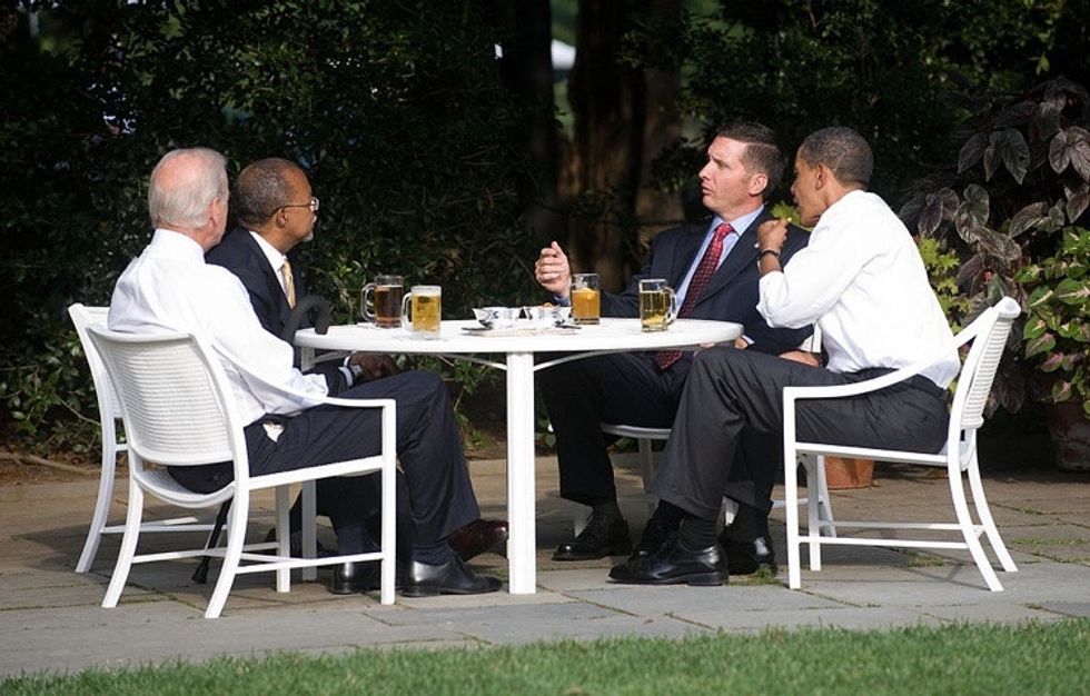 Police Sergeant James Crowley and Harvard Professor Henry Louis Gates Jr. with President Obama and Vice President Biden in 2009. Photo by Saul Loeb/AFP/Getty Images.
