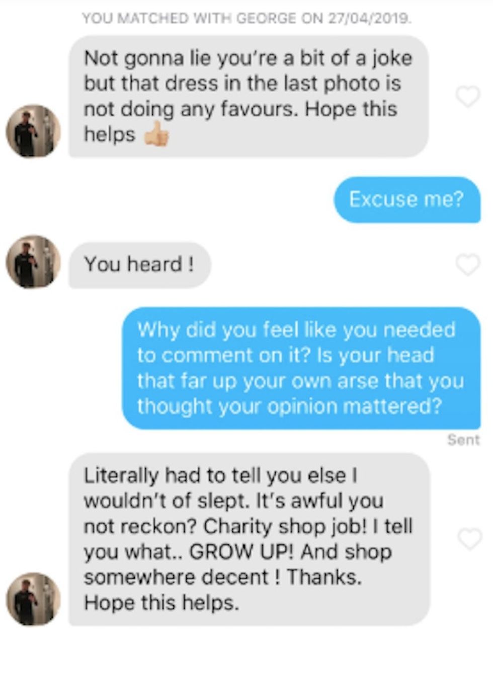 "Not gonna lie, you're a bit of a joke, but that dress in the last photo is not doing any favours. Hope this helps," read the guy's opening volley.