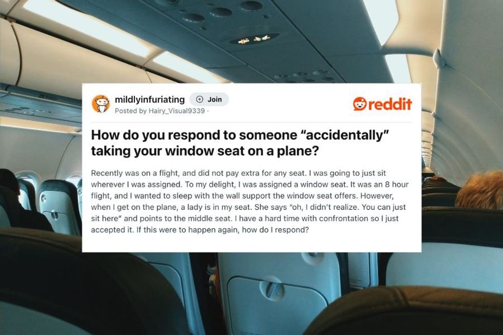 "It was an 8 hour flight, and I wanted to sleep with the wall support the window seat offers. However, when I get on the plane, a lady is in my seat. She says 'oh, I didn’t realize. You can just sit here' and points to the middle seat. I have a hard time with confrontation so I just accepted it. If this were to happen again, how do I respond," u/Hairy_Visual9339 asks.