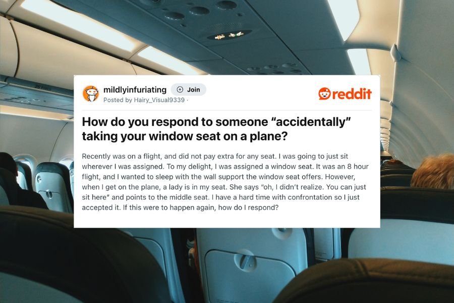 “It was an 8 hour flight, and I wanted to sleep with the wall support the window seat offers. However, when I get on the plane, a lady is in my seat. She says ‘oh, I didn’t realize. You can just sit here’ and points to the middle seat. I have a hard time with confrontation so I just accepted it. If this were to happen again, how do I respond,” u/Hairy_Visual9339 asks.