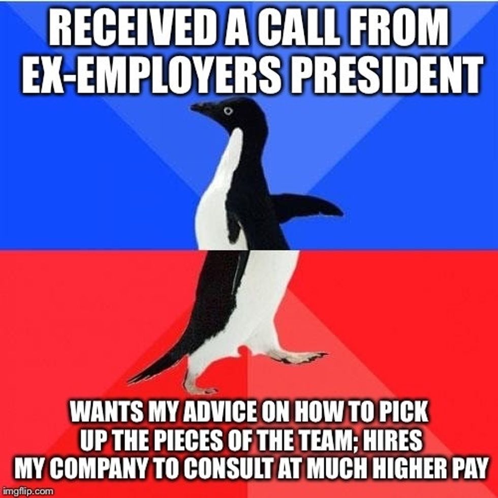 Things quickly fell apart at the old company, so the president called him to ask if he’d like to do some contract work. “I give them my rates, marked up by a good chunk because, well, they need me and not the other way around. They agree,” the Imgur user said.