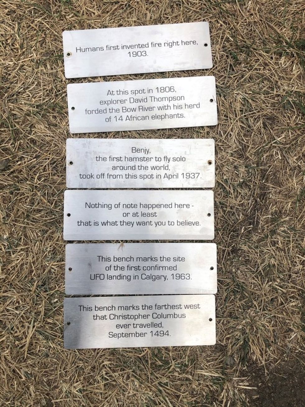 Someone placed funny, fake historic plaques on park benches around this Canadian city