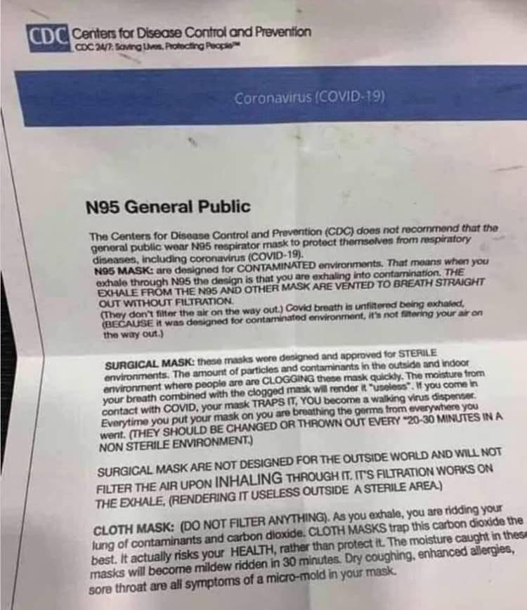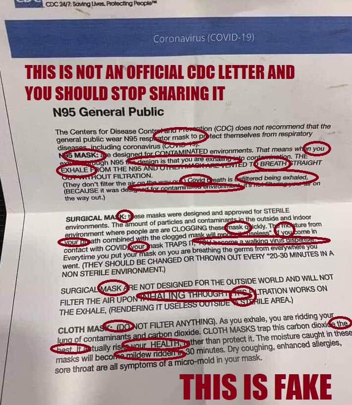 Anti-maskers have been passing around a bogus letter they claim is from the Centers for Disease Control that says the organization “does not recommend that the general public wear N95 respirator mask to protect themselves from respiratory diseases, including coronavirus (COVID-19).”