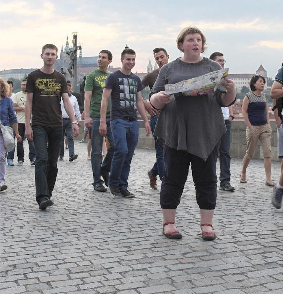 In an email to us, Morris-Cafiero explained that she set up a camera in the street and stood in front of it, doing mundane activities like looking at a map or eating gelato. While she's standing there she sets off her camera, taking hundreds of photos.