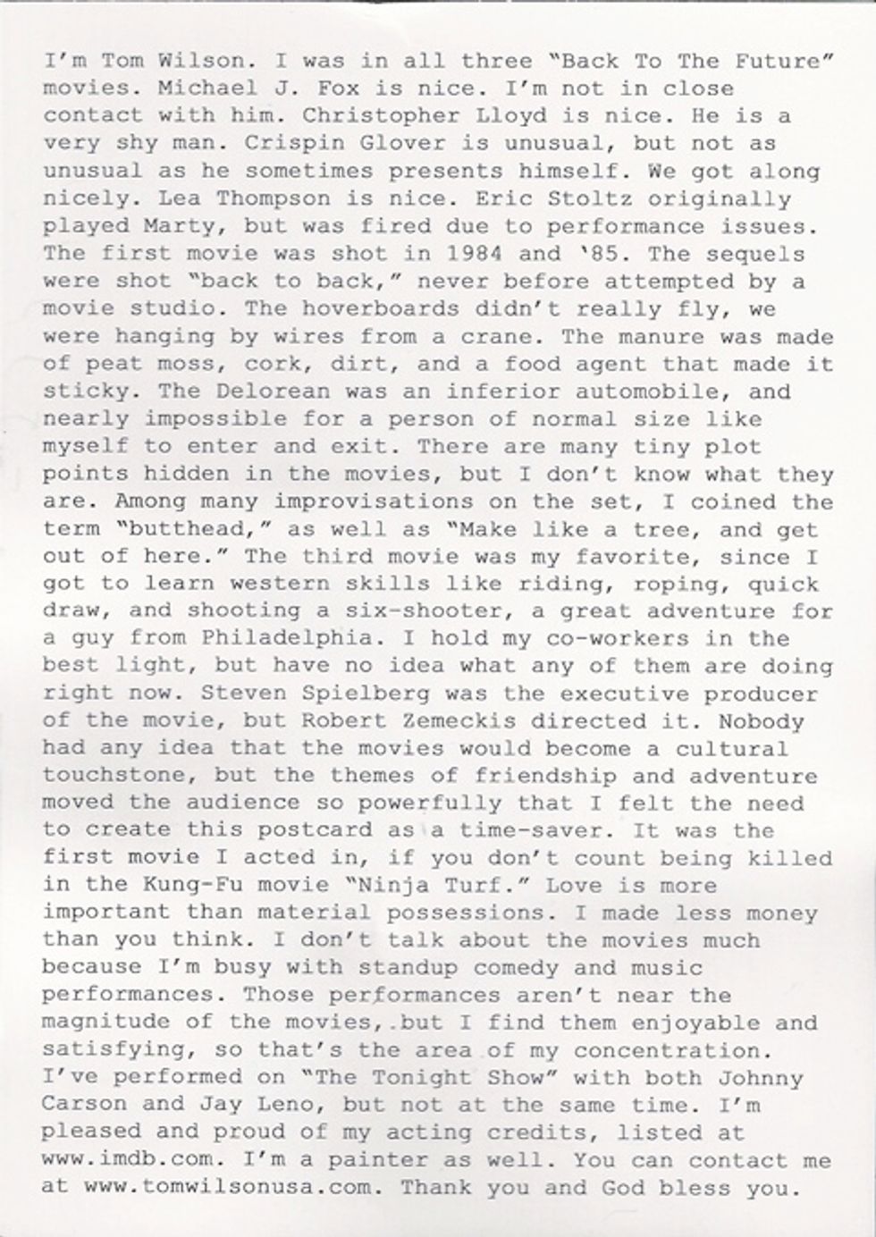 "I'm Tom Wilson. I was in all three 'Back To The Future' movies. Michael J. Fox is nice. I'm not in close contact with him. Christopher Lloyd is nice. He is a very shy man. Crispin Glover is unusual, but not as unusual as he sometimes presents himself. We got along nicely. Lea Thompson is nice. Eric Stoltz originally played Marty, but was fired due to performance issues.