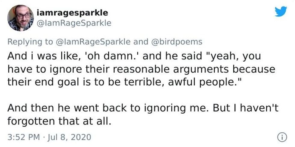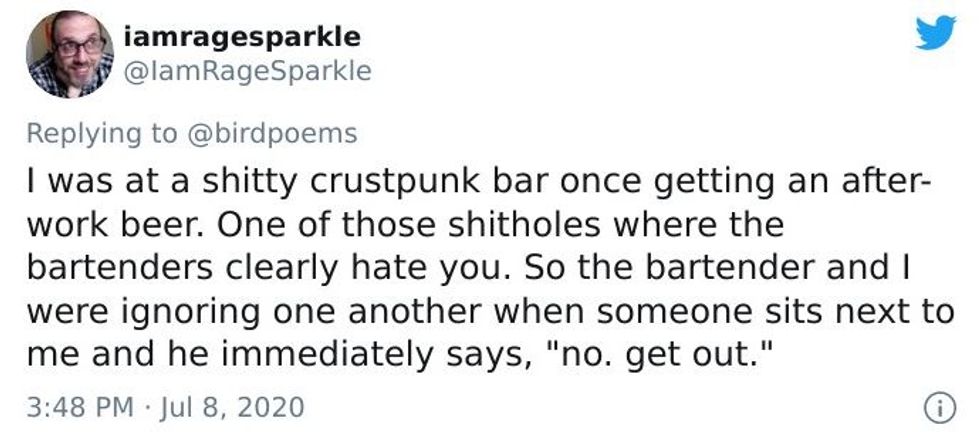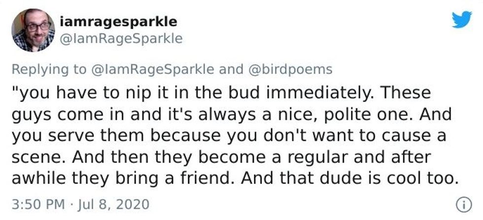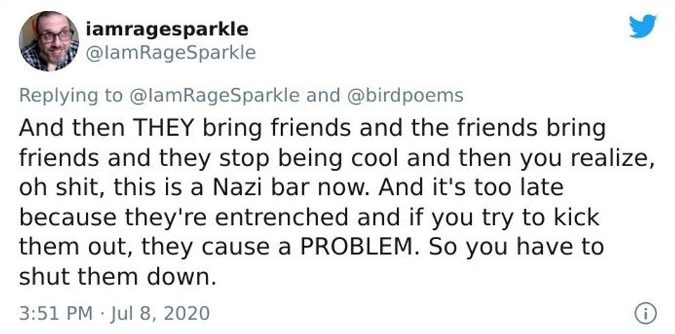 Michael B. Tager, a Baltimore-based writer and Managing Editor of Mason Jar Press, shared a similar scenario on Twitter recently that got a lot of attention. He shared a story of sitting in a punk bar when someone wearing Nazi paraphernalia sat down beside him.