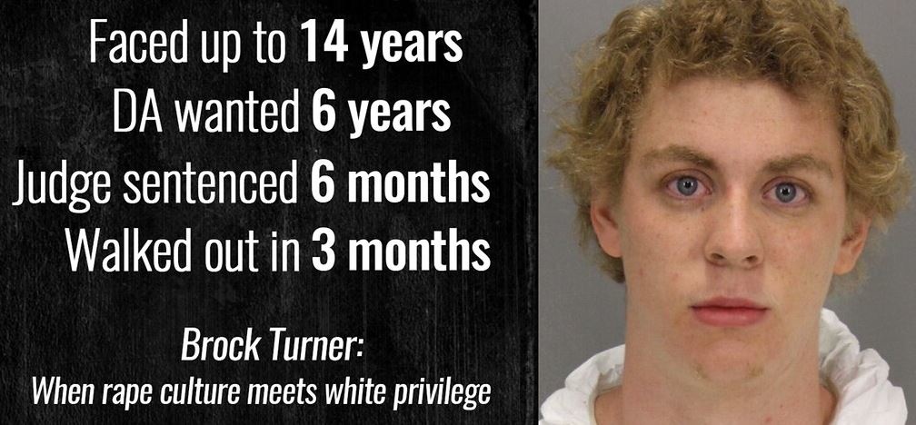 Turner faced 14 years in prison, but the college swimmer only received six months from Judge Aaron Persky who said “a prison sentence would have a severe impact on him, I think he will not be a danger to others.” As if prison time wouldn’t have a “severe impact” on just about anyone.
