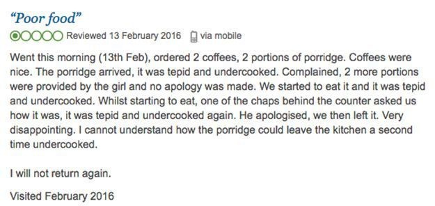 It all started with a TripAdvisor review knocking the Nook Neighbourhood Café for its “tepid” and “undercooked” porridge. The customer claims to have asked for three servings before eventually giving up.