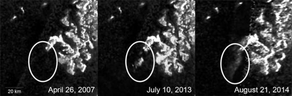 In several flybys of Titan between 2007 and 2014, the craft tracked the appearance of a "magic island" floating in a methane and ethane sea on the moon's surface.