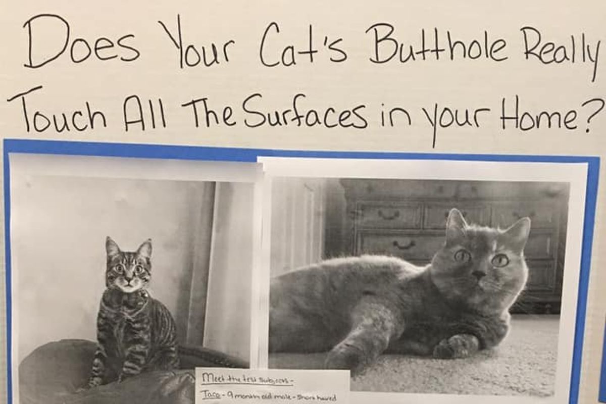 Cat owners sometimes have unique questions that even Google doesn't always have the answer to. This is probably the sole reason cat forums exist, but one kid who needed a 6th grade science project decided to skip the cat forums for answers and instead use the scientific method. Kaeden Henry, a sixth grader living in Florida, bravely pondered a question few (if any one) has been brave enough to ask: do cat buttholes touch every surface they sit on?