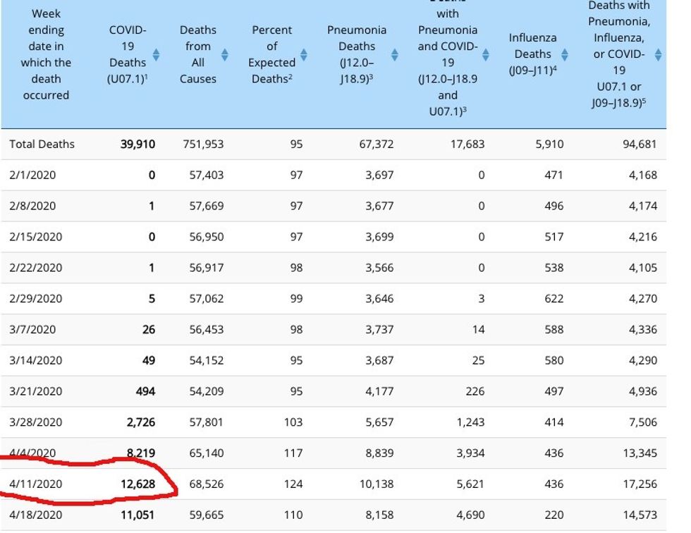 This is a screenshot of the Provisional Death Count as of April 16, 2020 (which you can access at this CDC link). As you can see, the COVID death count for the week of 4/11/20 was 3,542.