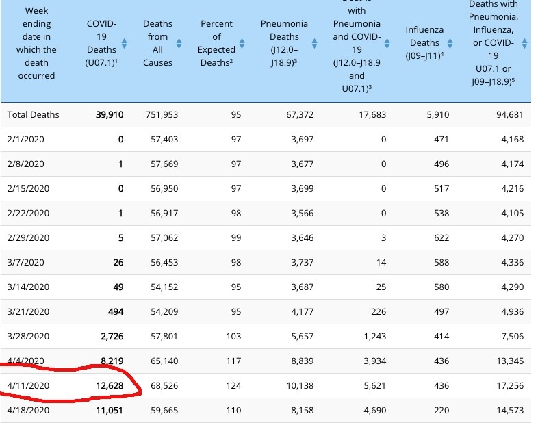 This is a screenshot of the Provisional Death Count as of April 16, 2020 (which you can access at this CDC link). As you can see, the COVID death count for the week of 4/11/20 was 3,542.