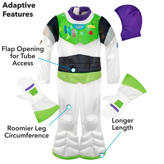 Your child will be able to defeat Emperor Zurg in comfort with the Buzz Lightyear costume featuring a discreet flap opening at the front for easy tube access, with self-stick fabric closure. There is also an opening at the rear for wheelchair-friendly wear, and longer-length inseams to accommodate seated guests. To infinity and beyond!