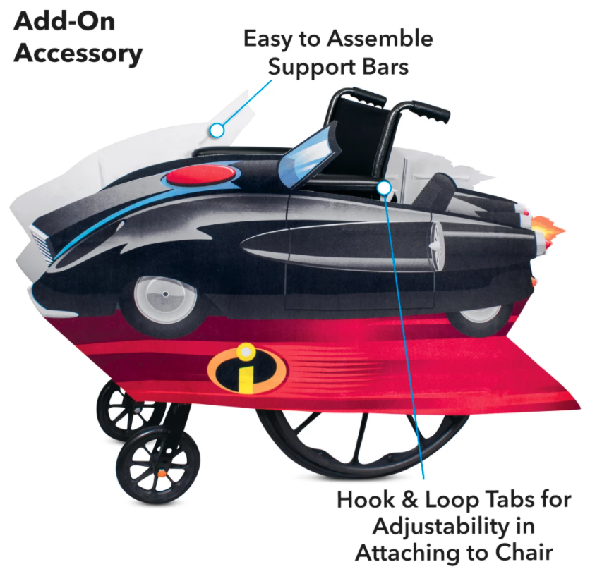 An added bonus: many of the costumes offer a coordinating wheelchair cover set to add a major boost of fun. Kids can give their ride a total makeover—all covers are made to fit standard size chairs with 24″ wheels—to transform it into anything from The Mandalorian’s Razor Crest ship to Cinderella’s Coach. Some options even come equipped with sounds and lights!