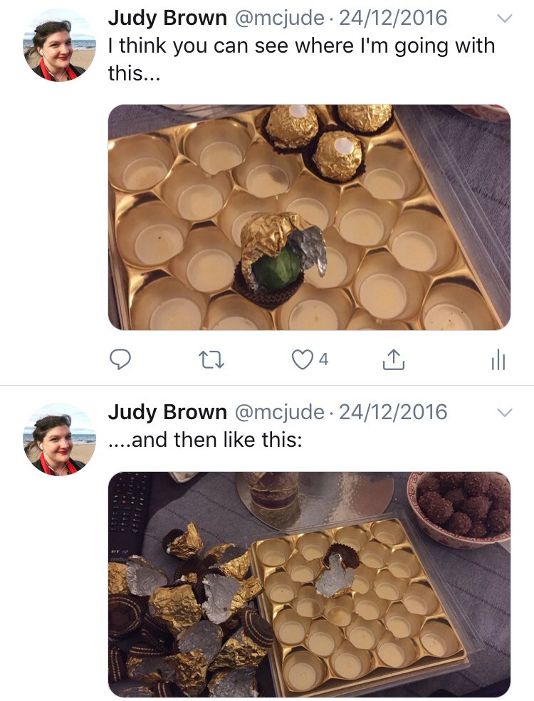 “I decided to play the long game & didn’t tamper with the confectionary: spooked by the year before, he would not touch a single Ferrero Rocher (which was great because he usually inhales them at 750mph) so there were Ferreros aplenty for the rest of us. I bided my time,” she wrote on X.