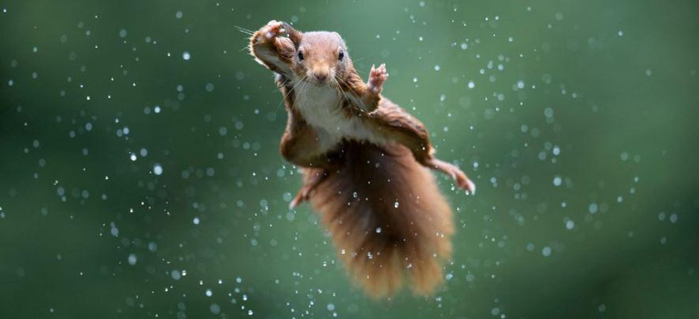 "A red squirrel jumps during a rainstorm, so you can see the drops flying around."