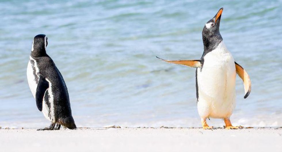 "This was shot on the Falkland Islands. These two gentoo penguins were hanging out on the beach when one shook himself off and gave his mate the snub."