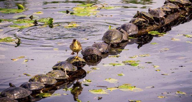 “A duckling walking/waddling across a turtle covered log at the Juanita wetlands, the duckling fell off after a few turtle crossings, it was cute.”