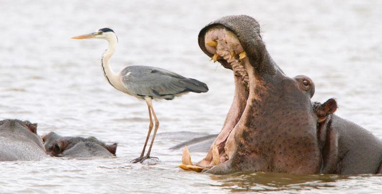 “Hippo yawning next to a heron standing on the back of another hippo.”