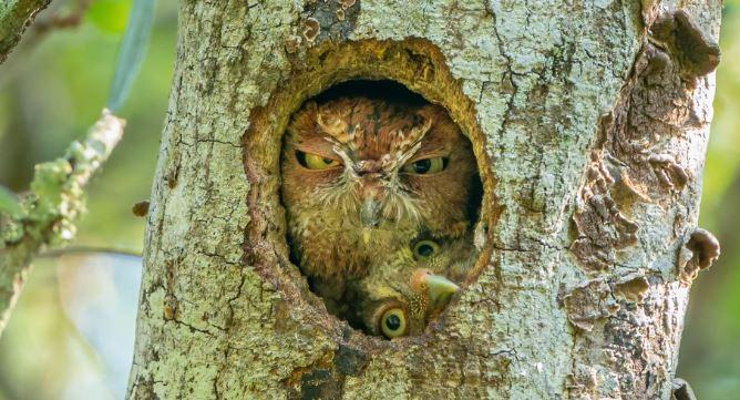 “I was going to see and photograph this eastern screech owl nest in a local park in Florida. One morning, a few days before the two owlets fledged, one owlet tried to squeeze into the nest hole with mom, maybe to see the outside world for the first time. It was hilarious and I was glad I was there that morning to photograph it. The moment lasted only a few seconds as Mom didn’t seem very happy with the arrangement. Check out the expression on her face.”