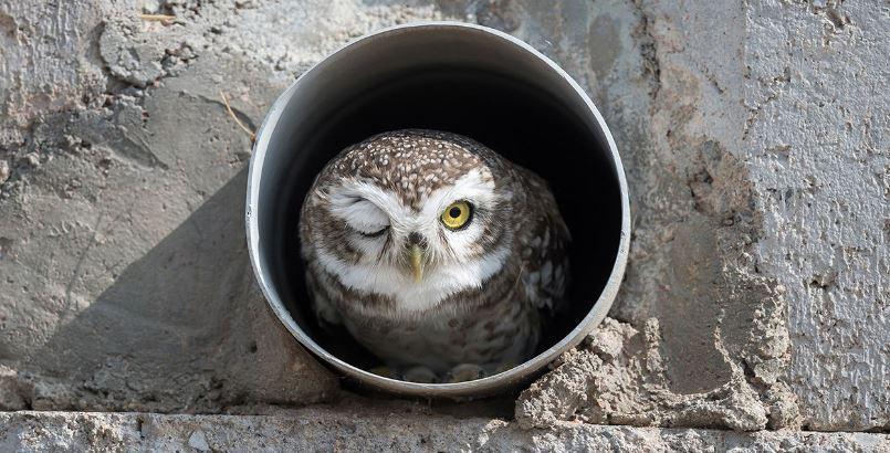 “Few hundred miles away we went to explore wildlife of a small town named ‘Bikaner’. It was after almost a year I travelled because of covid. We hired a guide to explore places around. During last day of our trip we came across a pipe in a city where we spotted an owlet. I have earlier clicked owls in a pipe before so I was sure that I wasn’t mistake. We waited for a short while and it didn’t take a long time and one of the spotted owlet came out of the pipe. It was really funny when he came out and looked at me straight, before going inside he closed one of his eyes and felt like he wanted to say ‘I CU boy!’ and I immediately snapped a picture when he gave this pose.”