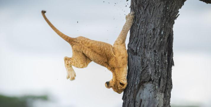 “This 3-month-old cub and his sibling were in a tree. The other lionesses were in other trees and on the ground. He wanted to get down and walked all over the branches looking for the right spot and finally just went for it. It was probably his first time in a tree and his descent didn’t go so well. He was just fine though after landing on the ground. He got up and ran off with some other cubs.”
