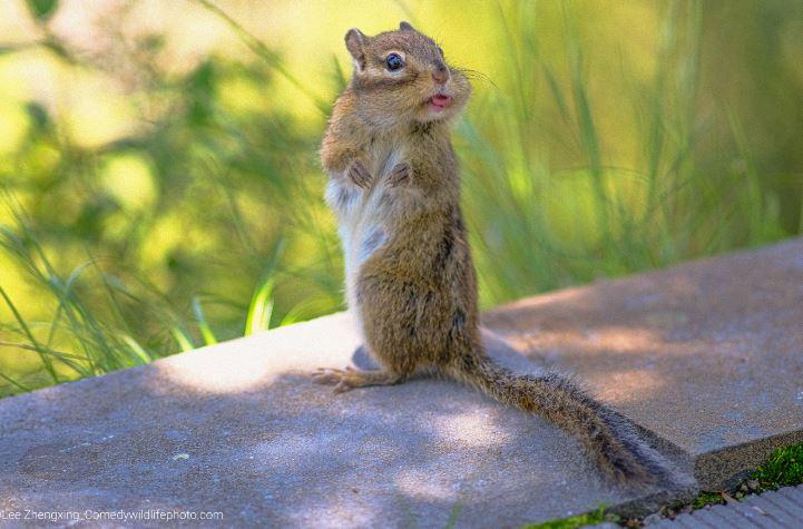 “We encountered this little squirrel when climbed mountain in June. When noticed our approaching, instead of escaping right away, he just kept standing on the edge of cliff and overlooked into the distance, then turned around to staring at us as if we had interrupted his meditation. We left him with some biscuits for inconvenience and I took a photo of him telling thanks, just found that he was a lisper.”