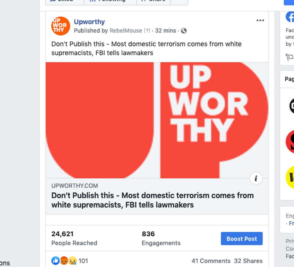 Aye, and here's the rub: What would get people clicking and reading is a less clear headline—maybe something like "FBI director tells lawmakers that most domestic terrorists come from a specific group of Americans." But you know what we'd be accused of then? Clickbait. People would complain that we were being vague on purpose, just for clicks. Facebook would ding us and squash our reach because its almighty algorithm would determine that—heaven forbid—we want people to actually click on our content and read it.