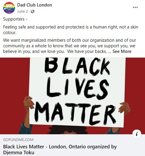 On June 2, the Dad Club London’s Facebook page posted a link to a local London, Ontario Black Lives Matter group that was looking for donations to provide supplies such as “masks, hand sanitizer, water, and signs to attendees.”