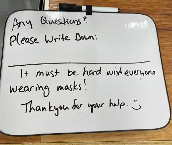 To keep his on-the-job independence, Simmons found some new solutions to help him so his job. He purchased a shirt online that says “I’m deaf” on the front, and “tap on the shoulder” on the back. He also got three wipe boards to carry around with him so customers can ask him questions.