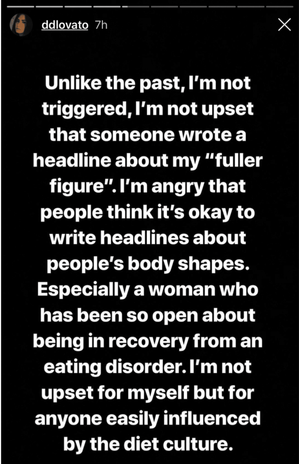 “Unlike in the past, I’m not triggered, I’m not upset that someone wrote a headline about my ‘fuller figure.’ I’m angry that people think it’s OK to write headlines about people’s body shapes. Especially a woman who has been so open about being in recovery from an eating disorder. I’m not upset for myself but for anyone easily influenced by the diet culture.”