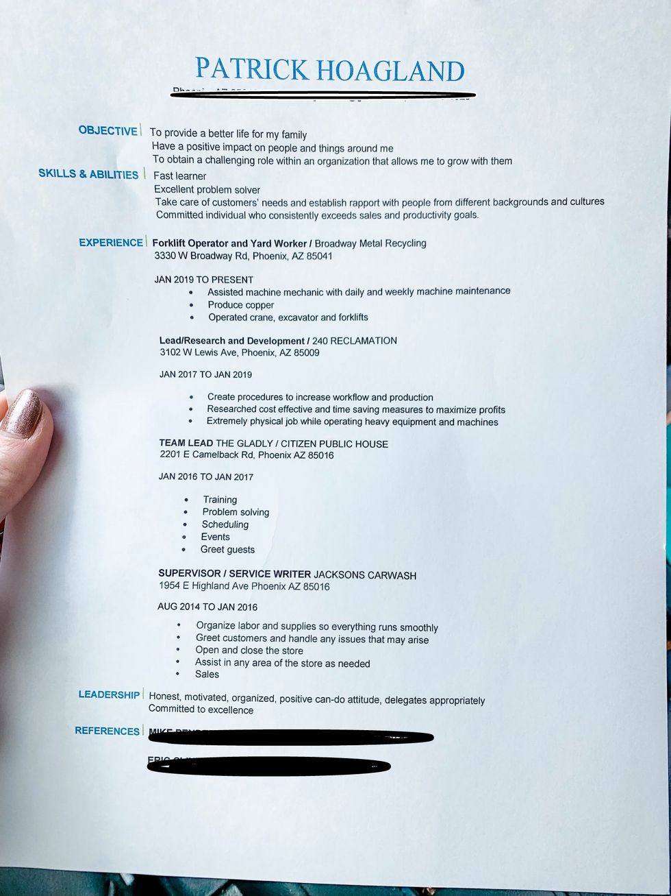 "I was driving down Camelback Road near my office and spotted this guy, Patrick, on the side of the road with a huge smile on his face in 110-degree heat, with a sign asking people to please take his resume," she wrote. "I love that he was not asking for a handout, just for people to consider him for a job."