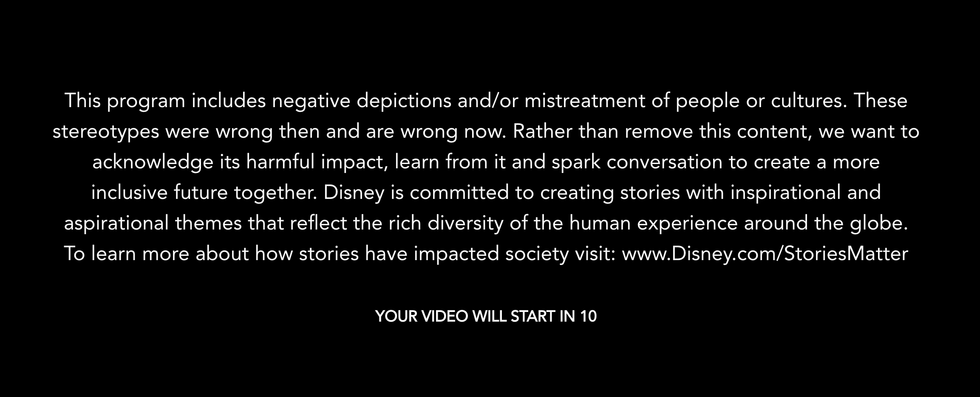 "This program includes negative depictions and/or mistreatment of people or cultures," the new label reads. "These stereotypes were wrong then and are wrong now. Rather than remove this content, we want to acknowledge its harmful impact, learn from it and spark conversation to create a more inclusive future together. Disney is committed to creating stories with inspirational and aspirational themes that reflect the rich diversity of the human experience around the globe."
