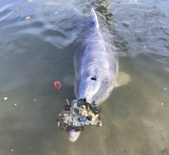 Dolphins at a popular tourist spot are bringing gifts to presumably entice humans to return