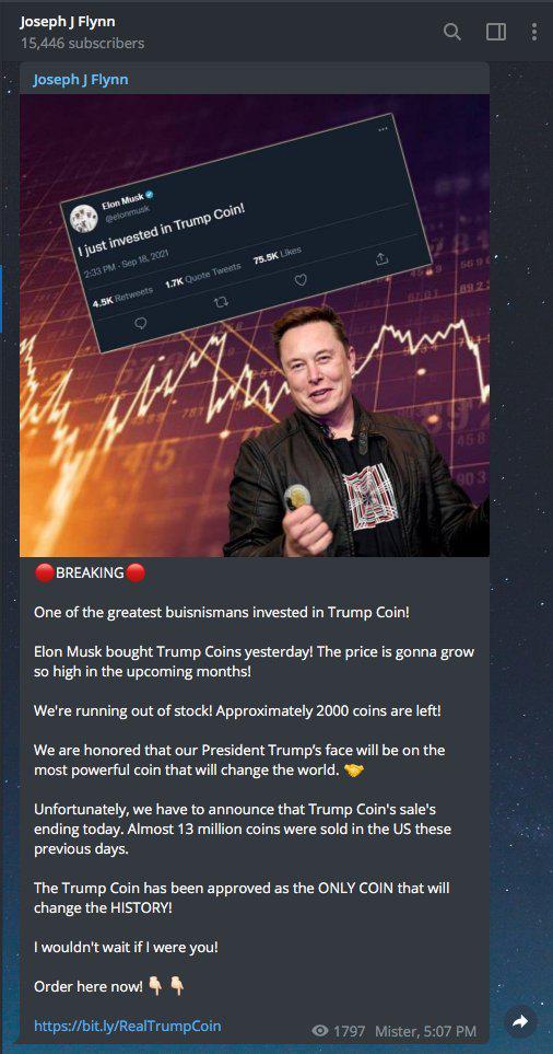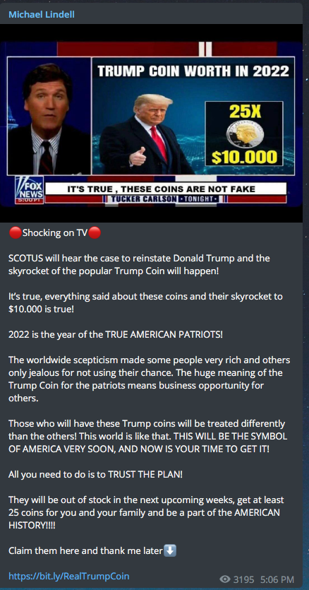 An online scam has popped up on Telegram, a social networking site popular with QAnon conspiracy theorists. Fake social media accounts of celebrities have cropped up on the app and after luring in followers with fake Hollywood secrets, they begin flogging a coin with Donald Trump’s face on it that promises huge returns.