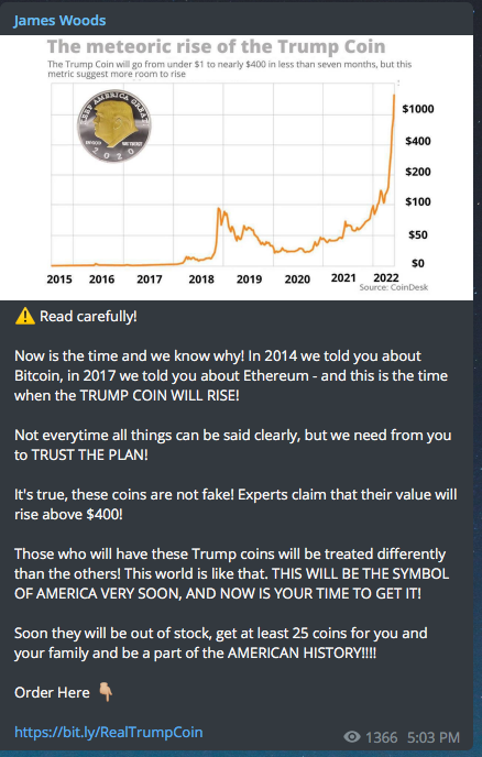 Another account claiming to be from conservative actor James Woods says the Trump Coins will rise exponentially, much like Bitcoin. But that logic falls flat once one considers the fact that Bitcoin is built on blockchain technology and Trump coins are nothing but gold-plated tchotchkes.