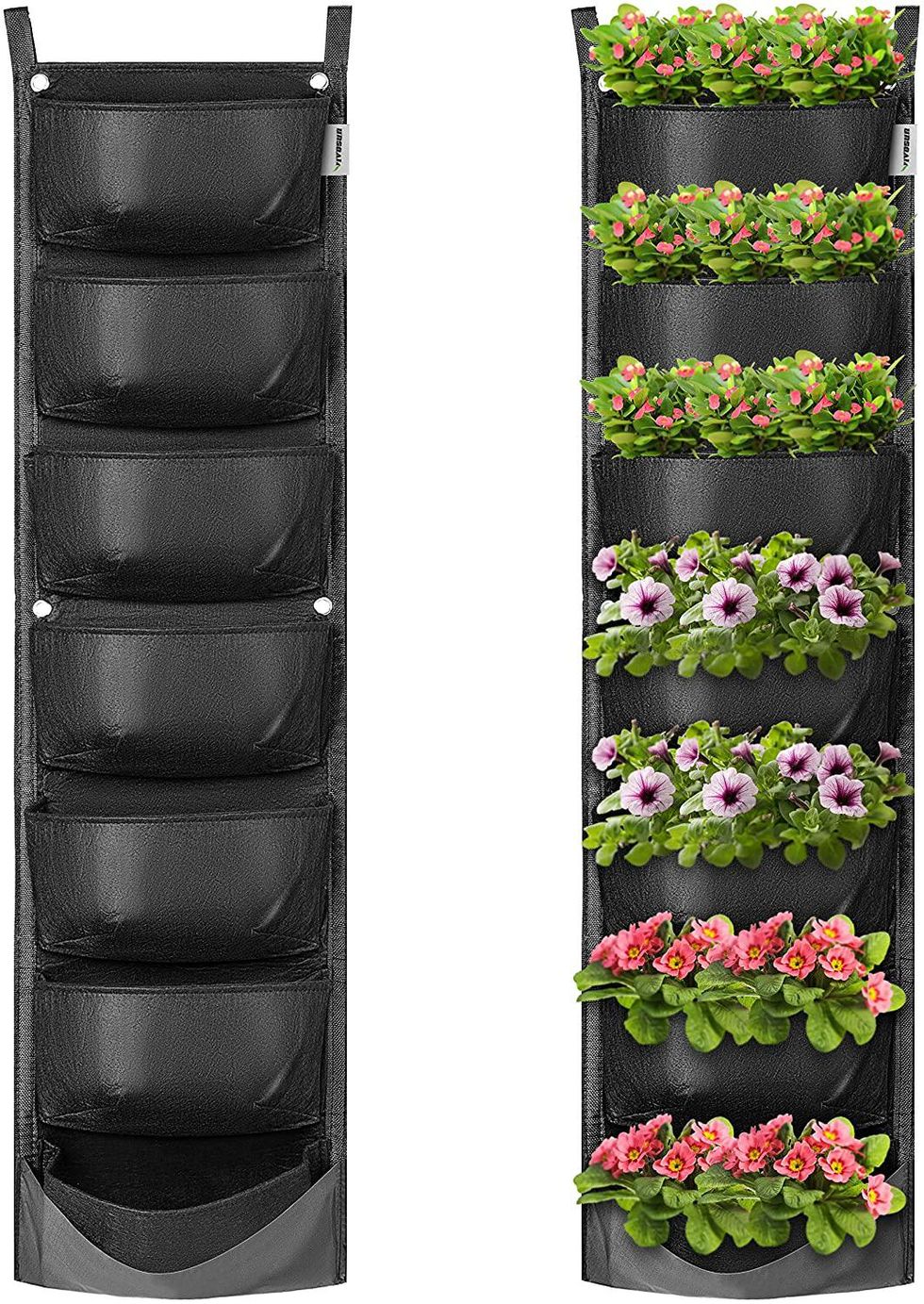 2. VIVOSUN 7 Pockets Vertical Wall Garden Planter. Perhaps the easiest way to get your vertical garden started is with a pocket pouch like the VIVOSUN 7 Pockets Vertical Wall Garden Planter. It looks similar to a shoe storage contraption that hangs on your door, and comes in smaller sizes up to the larger models that can hang on the fence in your backyard. Just be sure you leave space below to put something to catch any excess water if it is indoors.