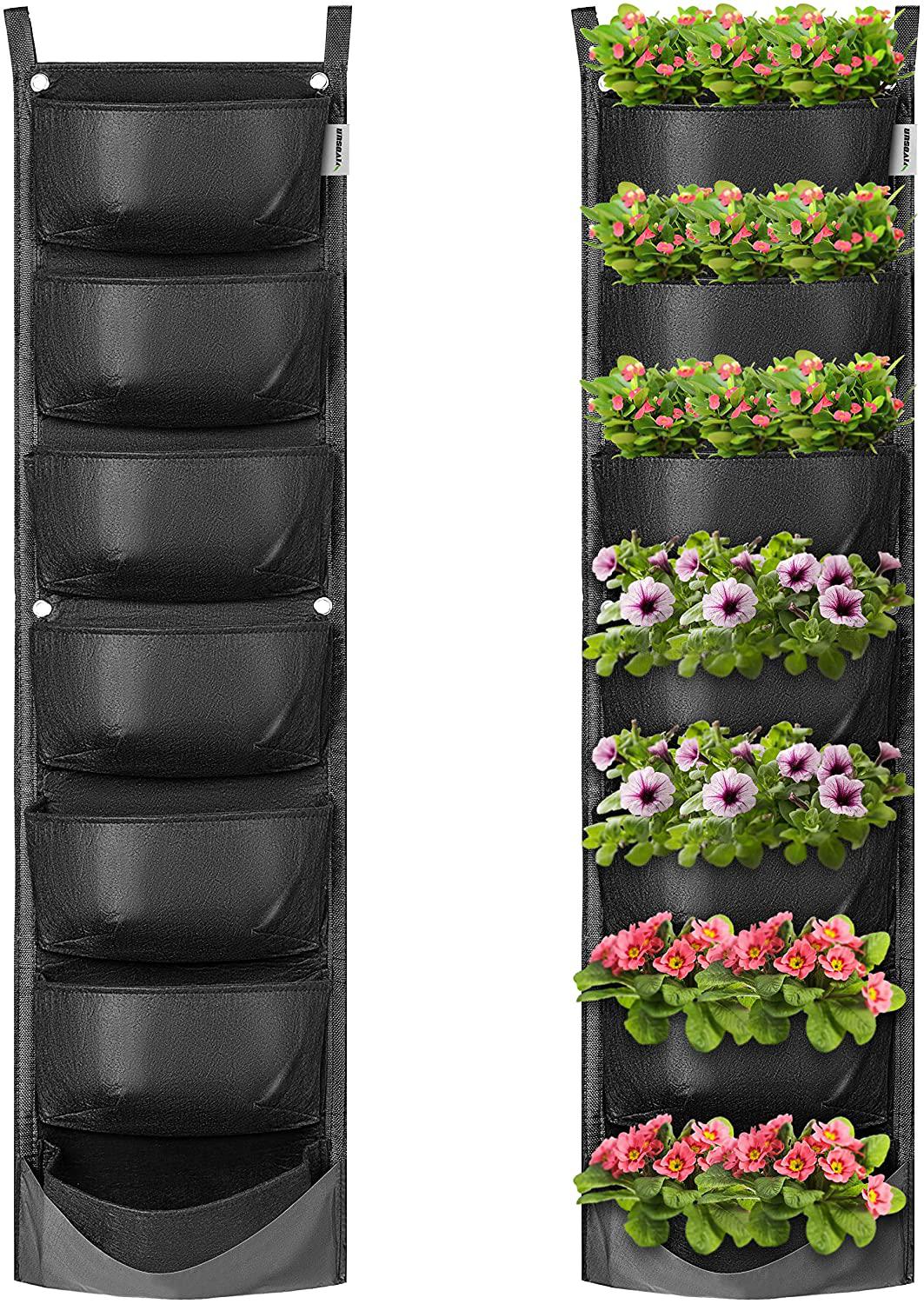 2.VIVOSUN 7 Pockets Vertical Wall Garden Planter. Perhaps the easiest way to get your vertical garden started is with a pocket pouch like the VIVOSUN 7 Pockets Vertical Wall Garden Planter. It looks similar to a shoe storage contraption that hangs on your door, and comes in smaller sizes up to the larger models that can hang on the fence in your backyard. Just be sure you leave space below to put something to catch any excess water if it is indoors.
