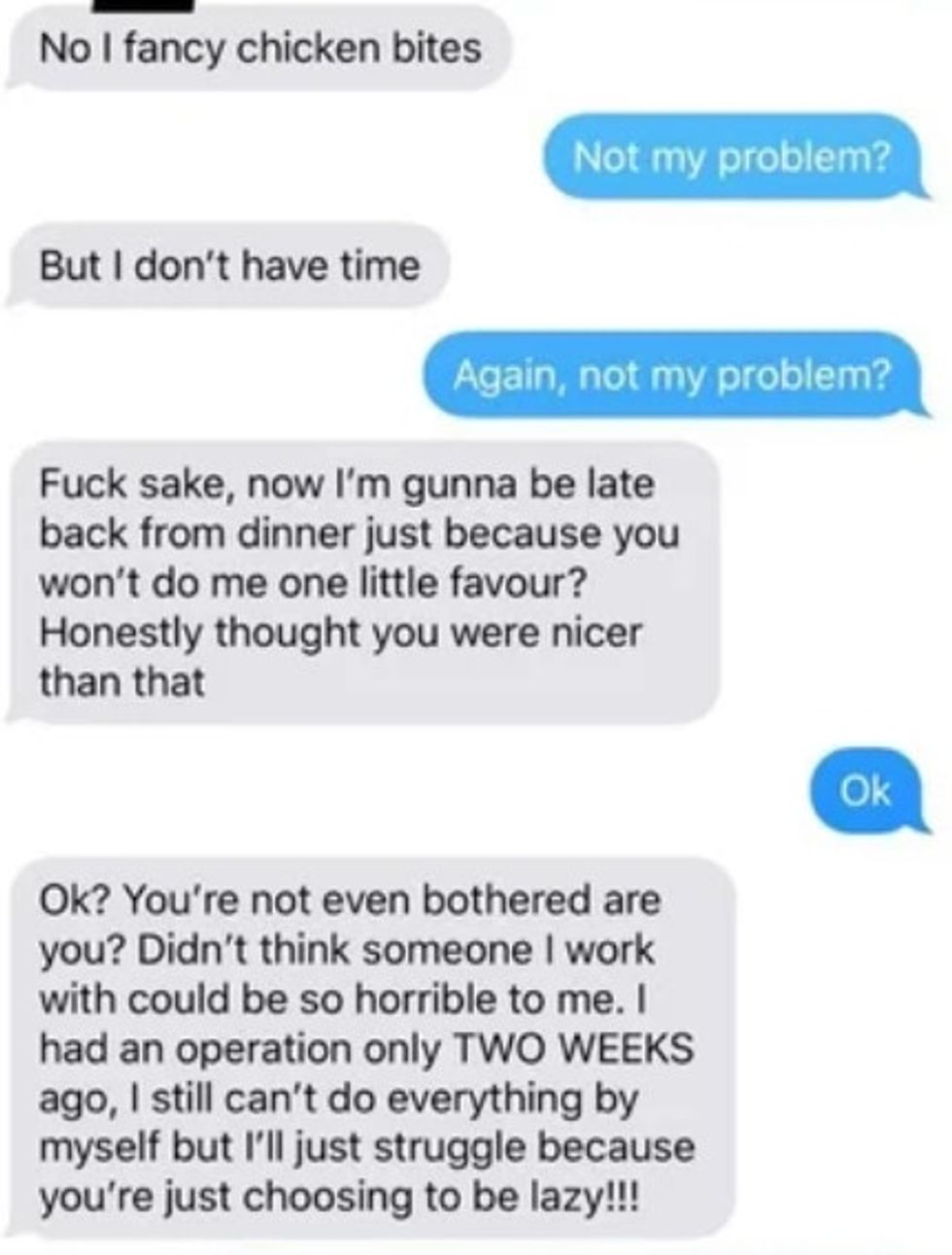 Luckily, Fandangoo had zero qualms about calling out the bonkers level of entitlement, and refused to be manipulated into doing free favors. This did not sit well with the coworker who quickly transformed into tantrum mode, even going so far as to call Fandangoo names.