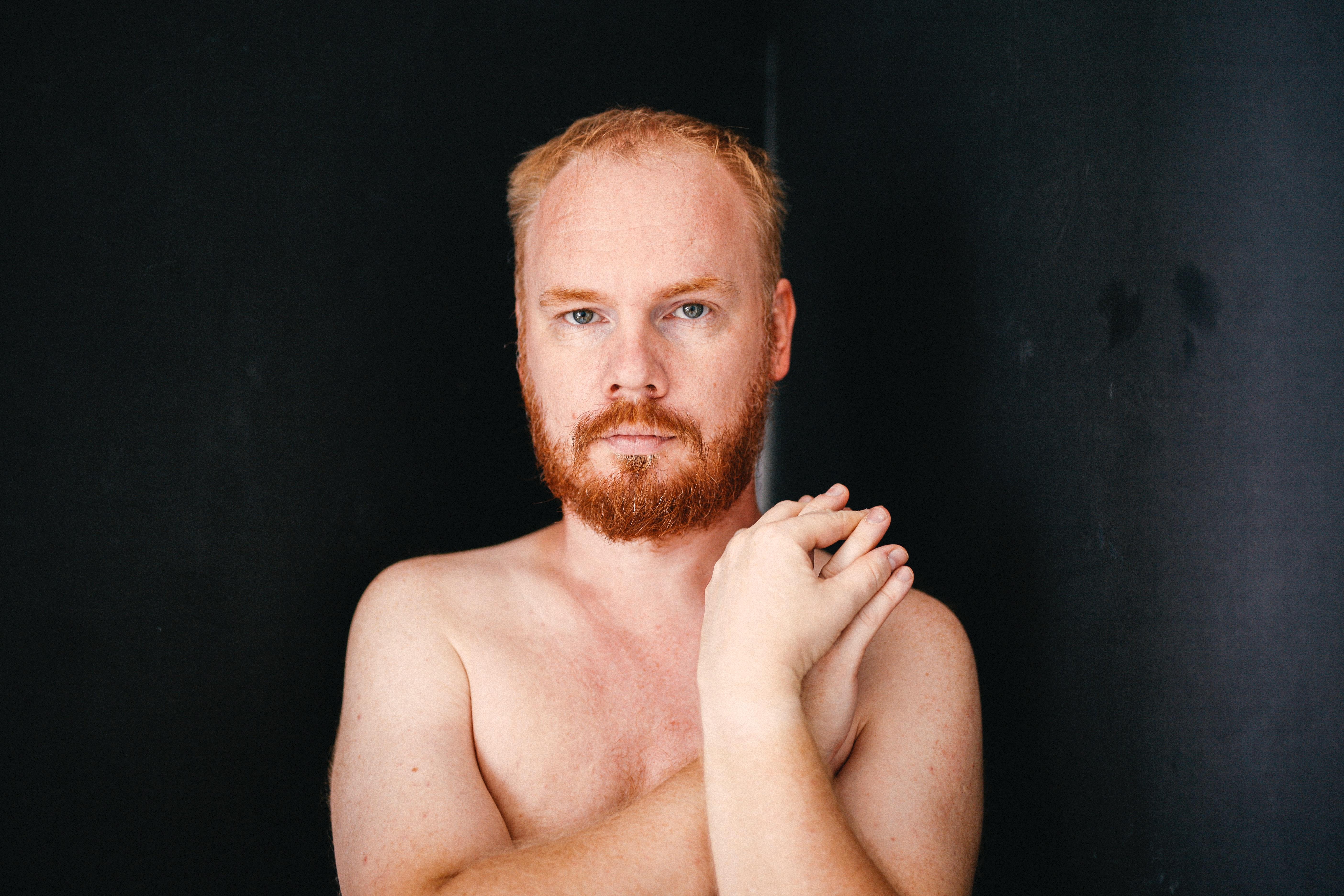 Topless man with black background.