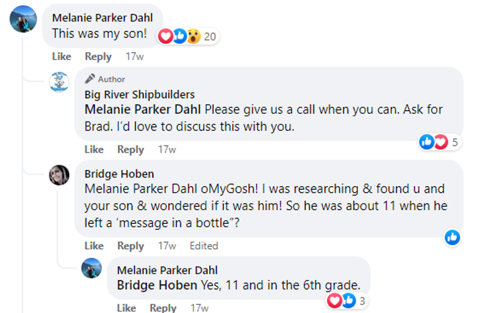 The guys from Big River posted a photo of the note on Facebook where it was shared 127 times. A few days after the picture was posted, Dr. Eric Dahl received a phone call from someone who told him about the post. Melanie Parker Dahl then left a comment on the post.