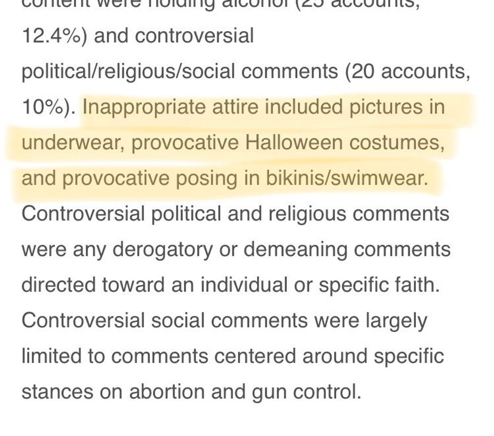 The major bone of contention that medical professionals had with the study is that the team of predominantly male researchers said that "provocative posing in bikinis/swimwear," "provocative Halloween costumes," and "holding/ consuming alcohol" are all inappropriate.