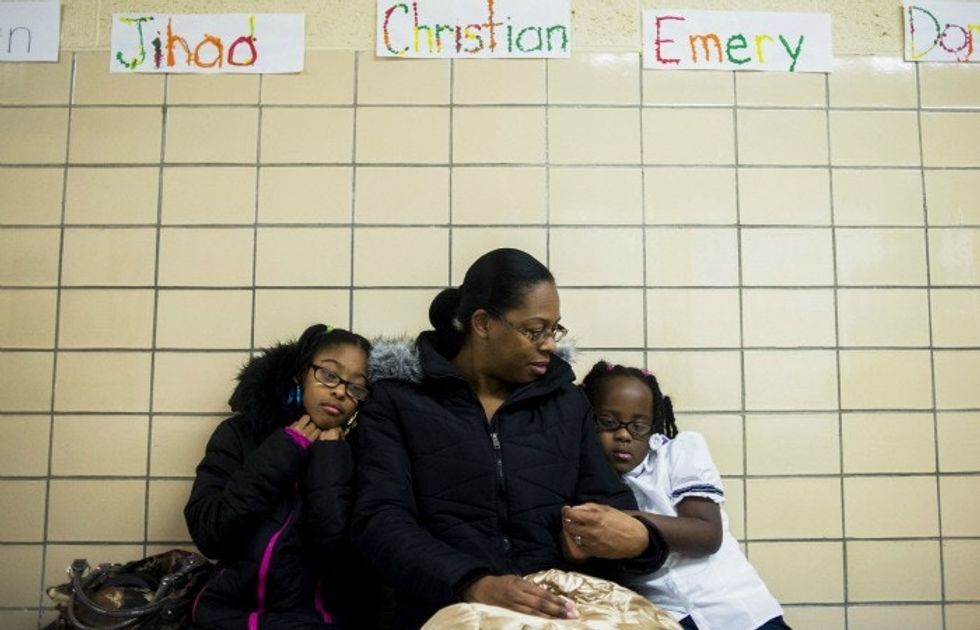 LaShanti Redmond (left), 10, and her sister Asharra Smith, 6, wait with their mother, Charlene Mitchell, of Flint, to get their blood tested for lead levels on Jan. 12, 2016. The Flint Community Schools, the Genesee County Health Department, and Molina Healthcare held a family fun night to get children ages 0-6 tested for lead levels in their blood. Image by Jake May/The Flint Journal-MLive.com via AP.