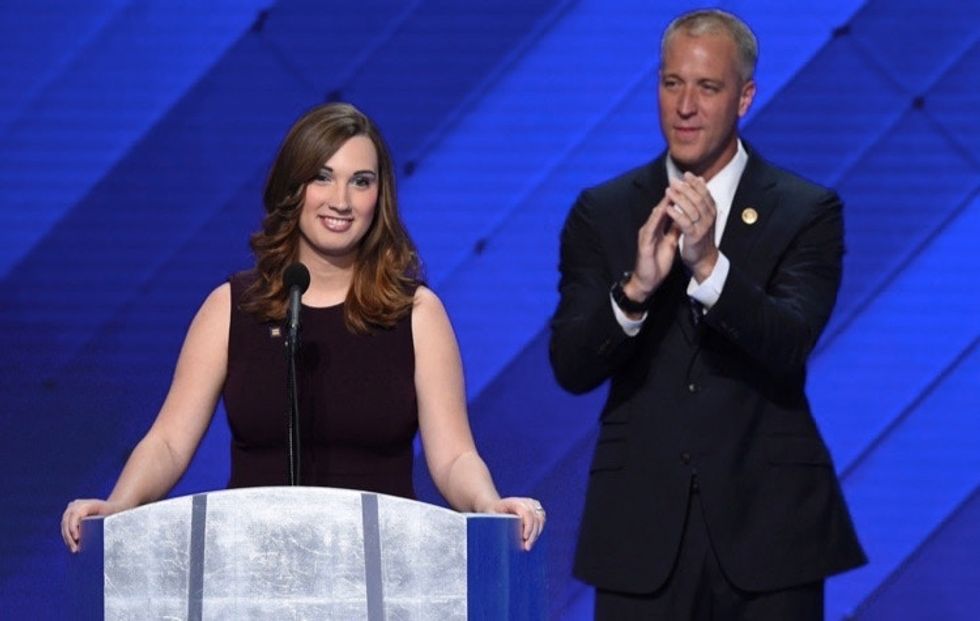 LGBT rights activist Sarah McBride and co-chair of the Congressional LGBT Equality Caucus, Congressman Sean Patrick Maloney of New York, at the Democratic National Convention on July 28, 2016 in Philadelphia. Photo by Saul Loeb/AFP/Getty Images.