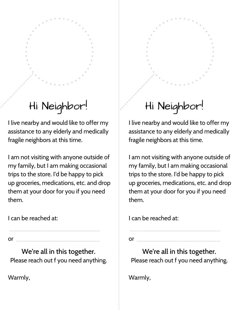 Simply print, cut along the lines, fill in your information, and deliver to your neighbors' doors. (Wash your hands thoroughly first, of course. And don't greet neighbors face-to-face—now is a perfect time for a "ding-dong ditch.") There's no way to know who needs them—even young, seemingly healthy people can have invisible conditions that compromise their immune system—so we left them at every house within a certain radius of our house.