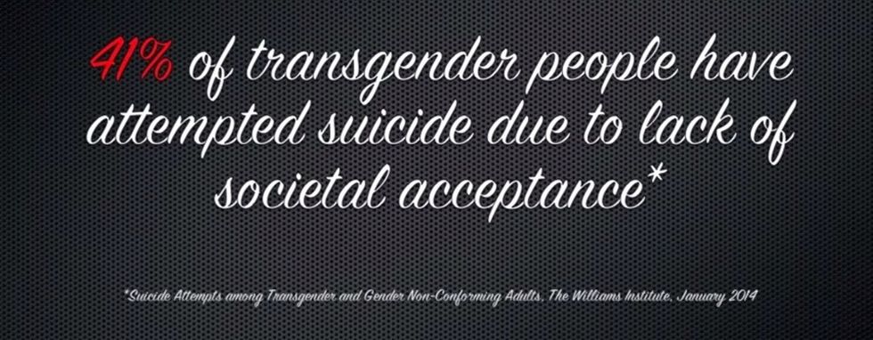 Studies show that 41% of transgender adults have attempted suicide. Take a minute to think about that number. It's nine times higher than the average attempted suicide rate. Here's what we need to know: "Suicide attempts were less common among transgender and gender-nonconforming people who said their family ties had remained strong after they came out."