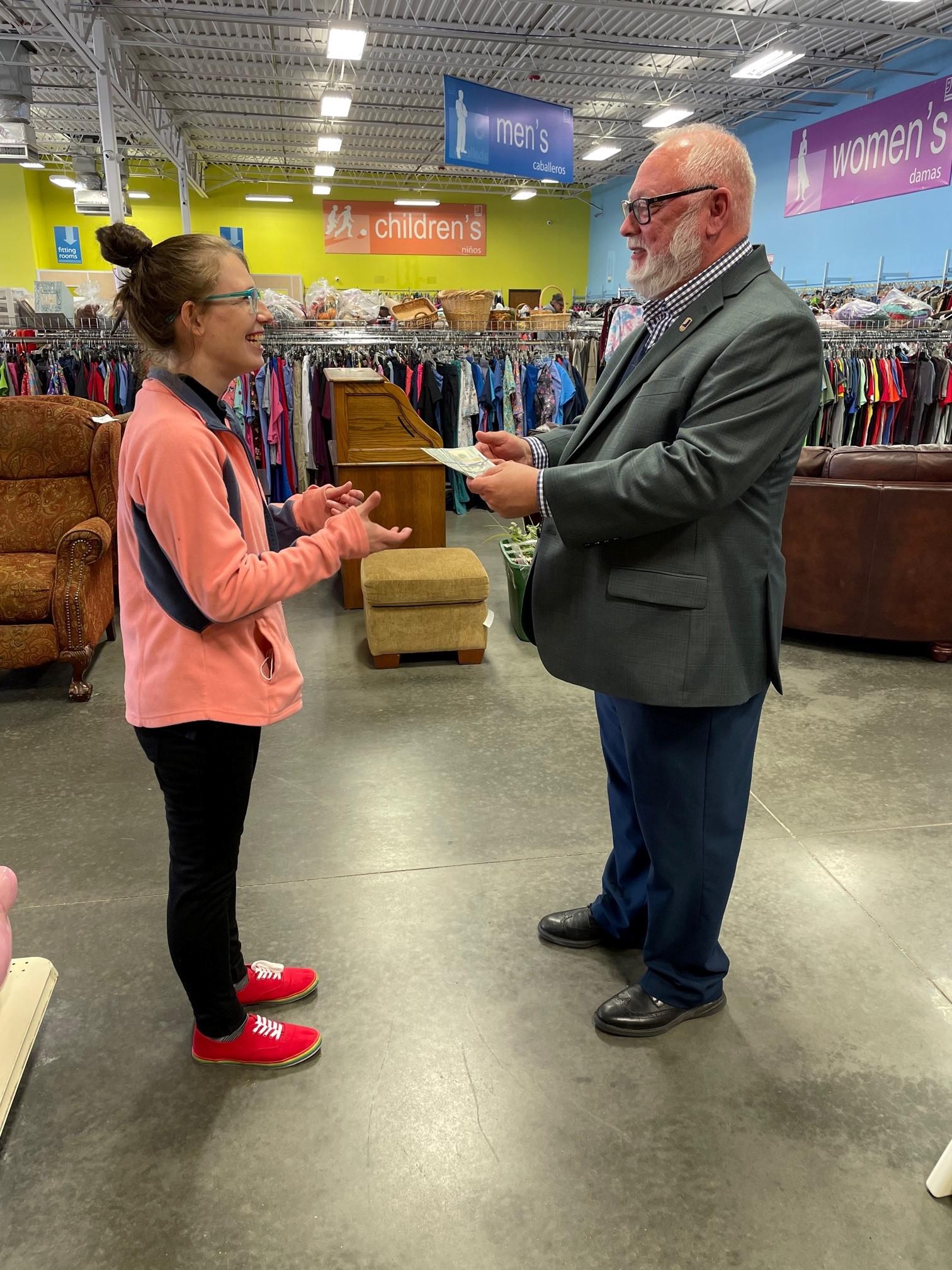 Goodwill V.P.u00a0Frank Holland handing Lessing her reward.