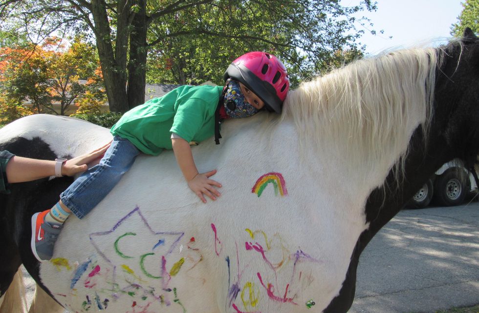 In addition to the day camp, they have also found ways to make horses accessible to immunocompromised, homebound patients through their Horsey House Call program. "[It] deploys 30 times a summer to knock on the doors of vulnerable children and surprise them with a horse for the afternoon," she explains. "Our all-volunteer team and therapy horse stays for about 3 hours to provide rides, grooming lessons, games, crafts, pizza, music, and more."